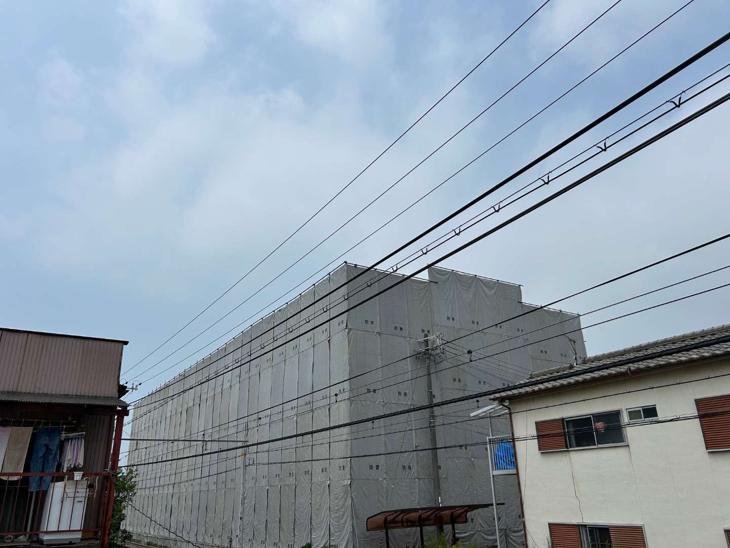 列車運行時間帯は作業制限があるため、近隣の皆様のご理解をいただき、終電から始発までの夜間時間帯に外部足場および防音シートの設置を実施しました。
